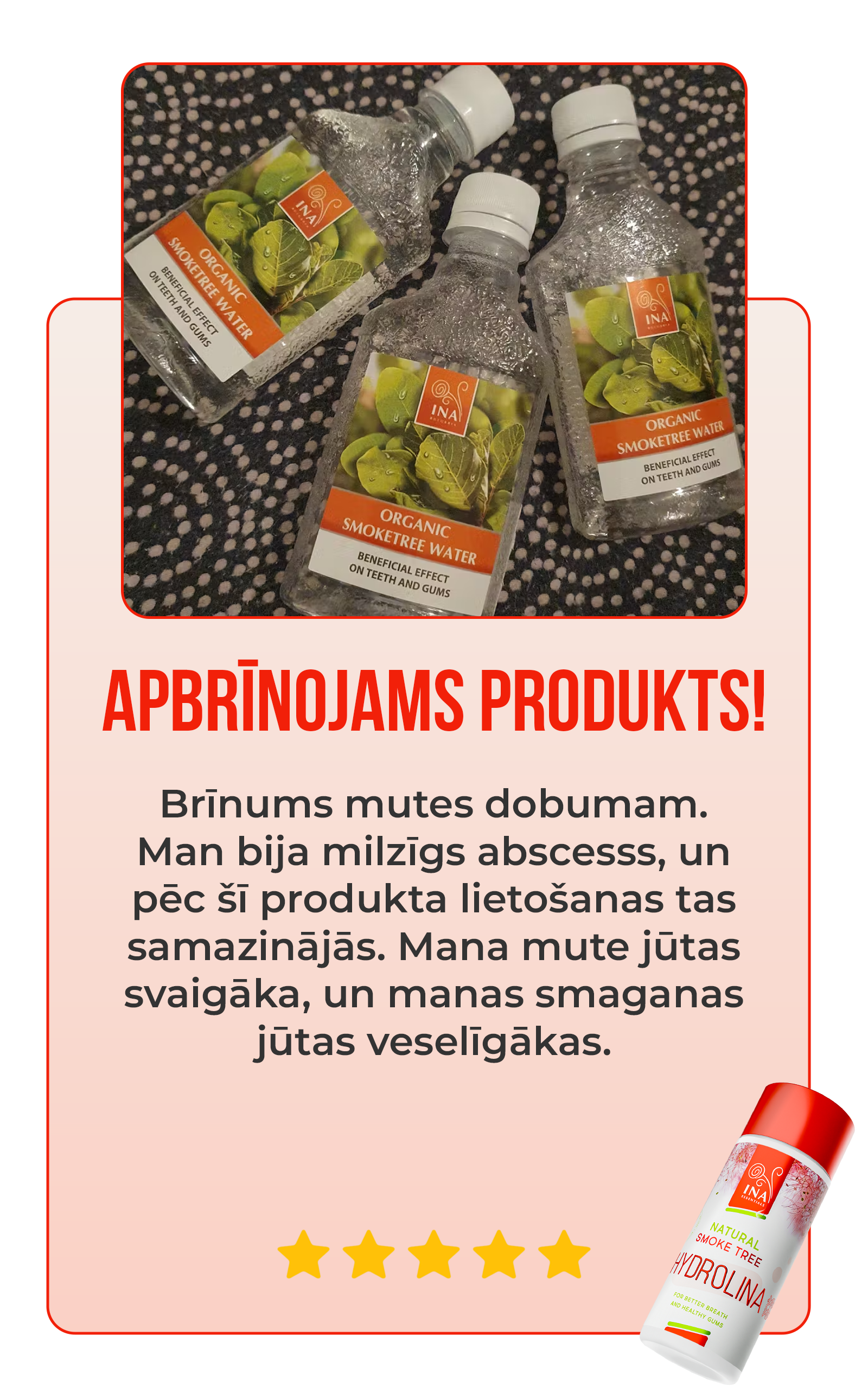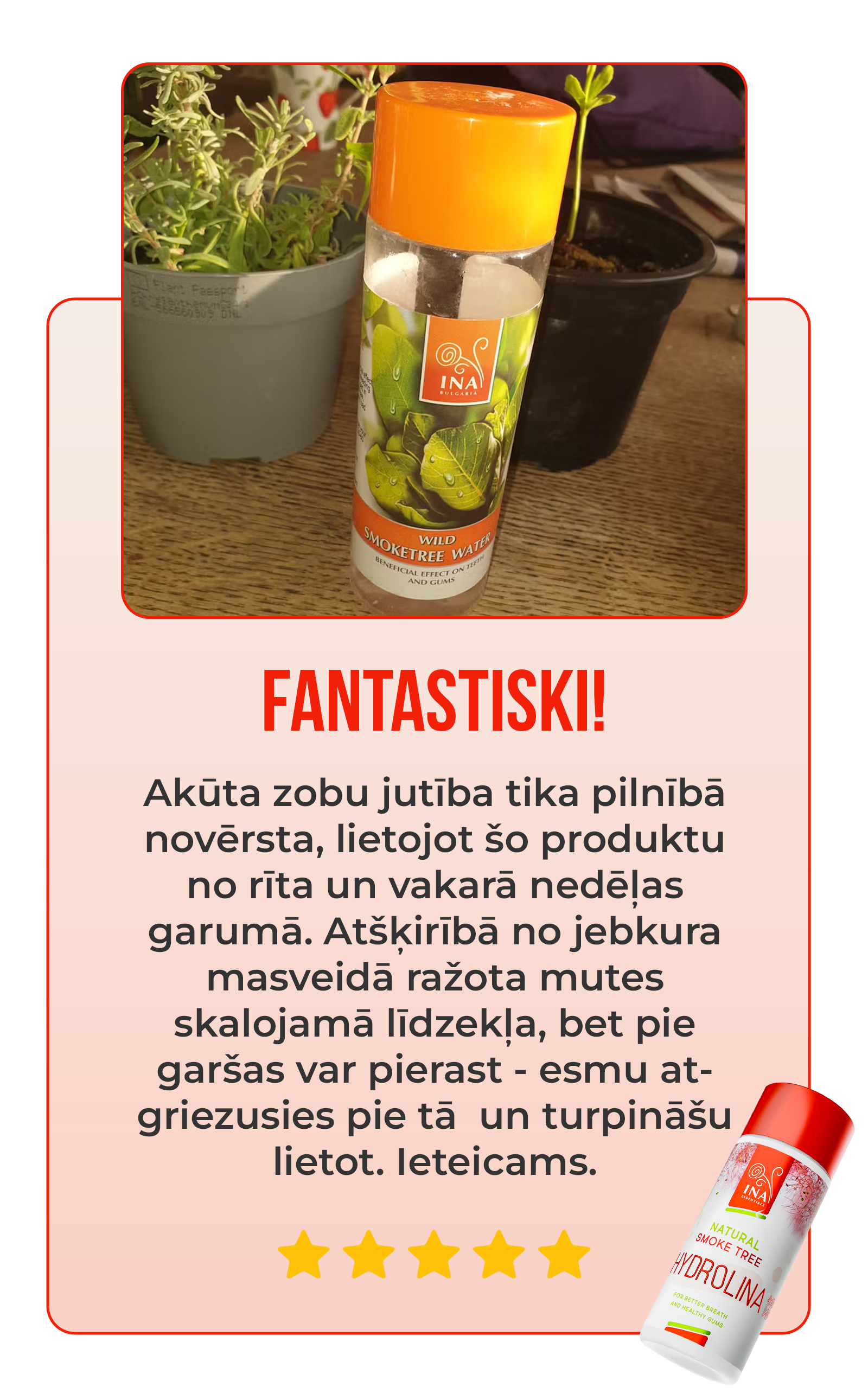 Dūmu koka Hydrolina (150 ml) ir ne tikai skaista pudelīte. Klīniskajos testos tā panākumu rādītājs ir vairāk nekā 90%, un tas pierāda, ka tā iedarbība mazina smaganu asiņošanu un sliktu elpu, kā arī uzlabo vispārējo mutes dobuma veselību. Noklikšķiniet, lai apskatītos informāciju par sertifikātu.