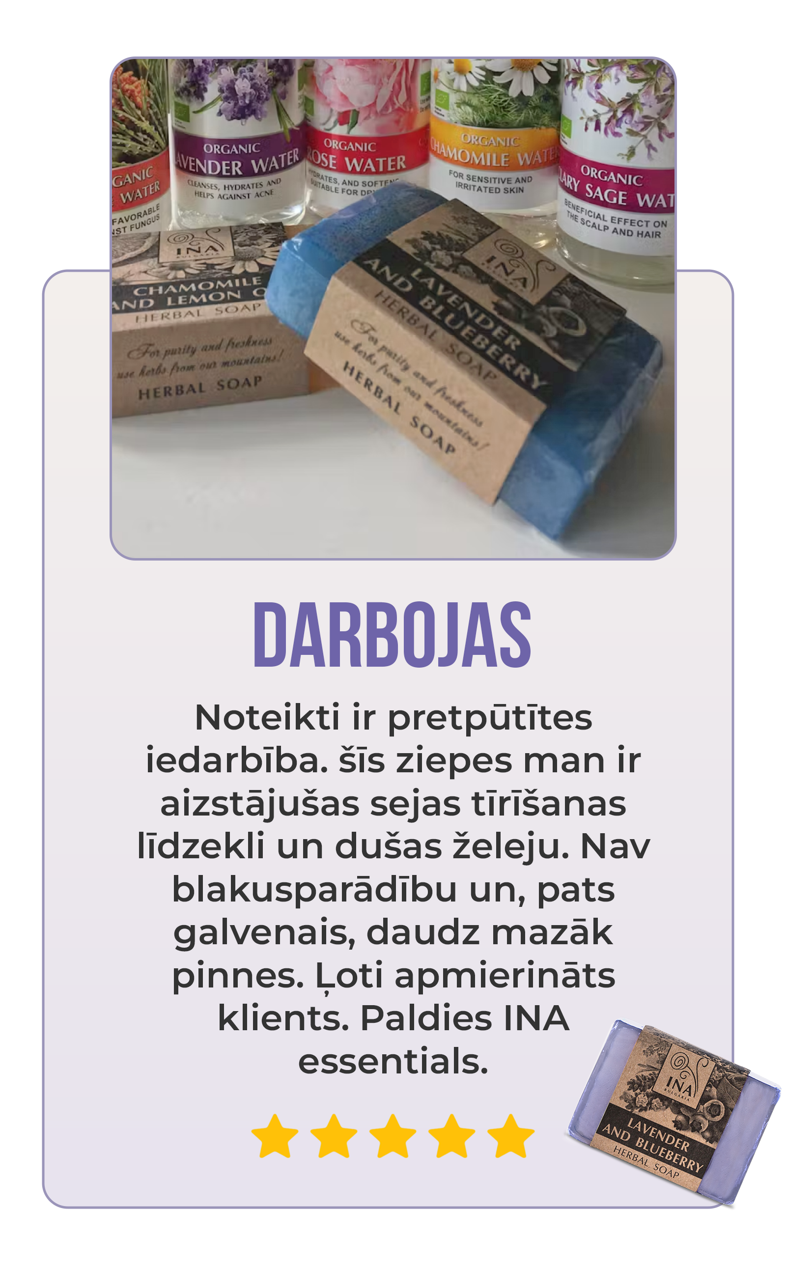 - 1. Solis: Notīriet ādu ar mūsu lavandas un melleņu ziepēm, lai nomazgātu visus netīrumus.