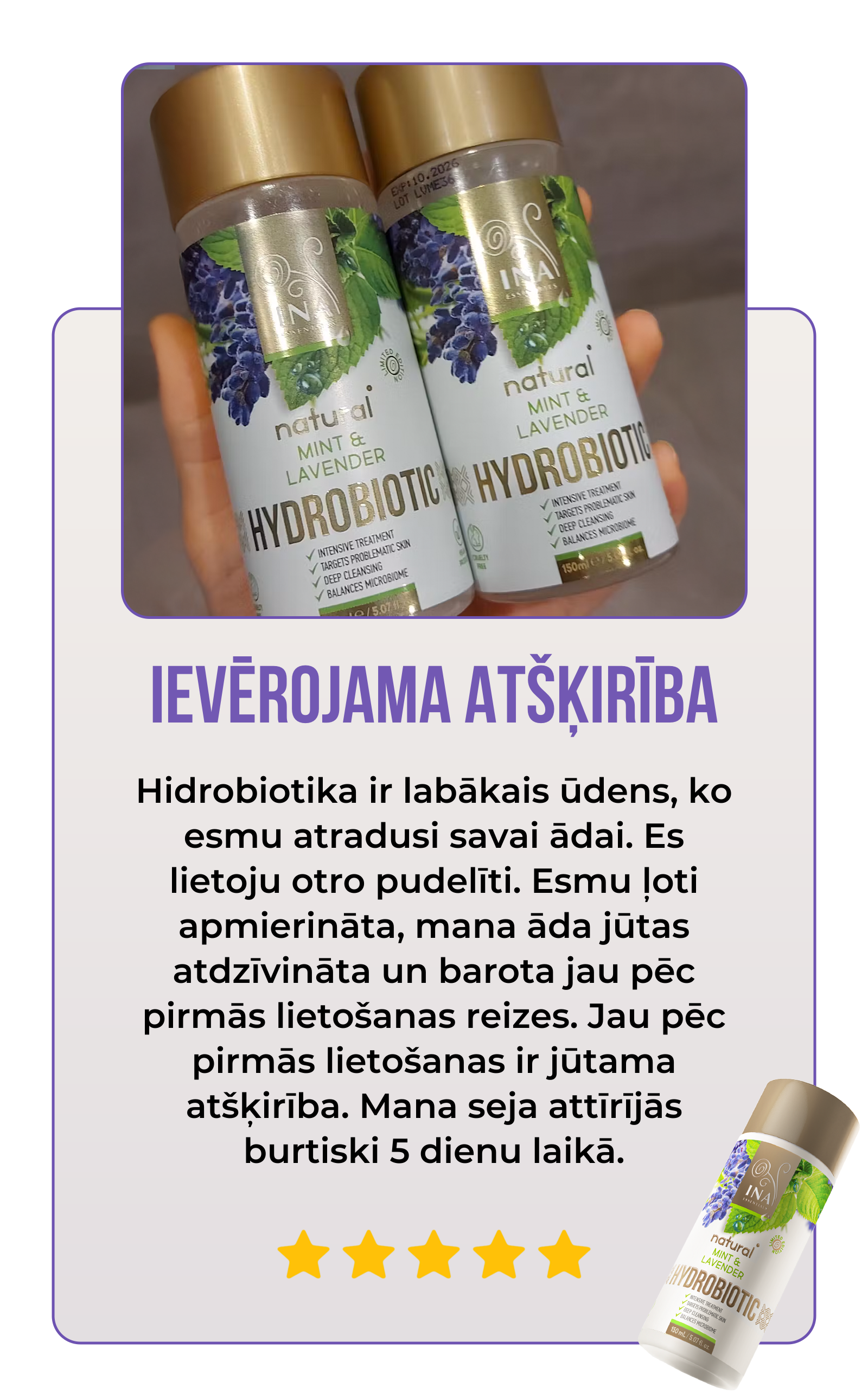 - 2. Solis: Pēc tam lietojiet Hydrobiotic - lavanda un piparmētra. Šīs inovatīvās formulas pamatā ir Lentimyrt postbiotiskais komplekss. Šī unikālā formula nodrošina intensīvu dabisku kopšanu problemātiskai ādai. Lentimyrt - mūsu postbiotiskajam kompleksam piemīt unikālas īpašības ādas pH regulēšanai, kas ir galvenais faktors skaistai un veselīgai ādai.