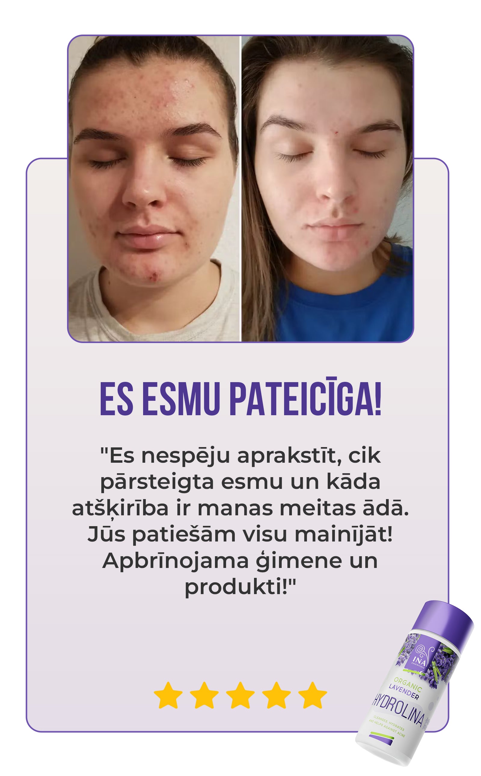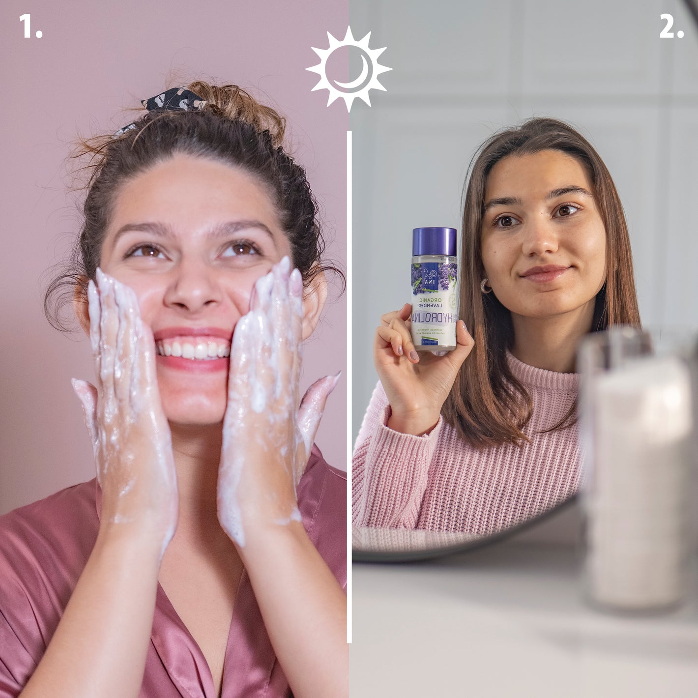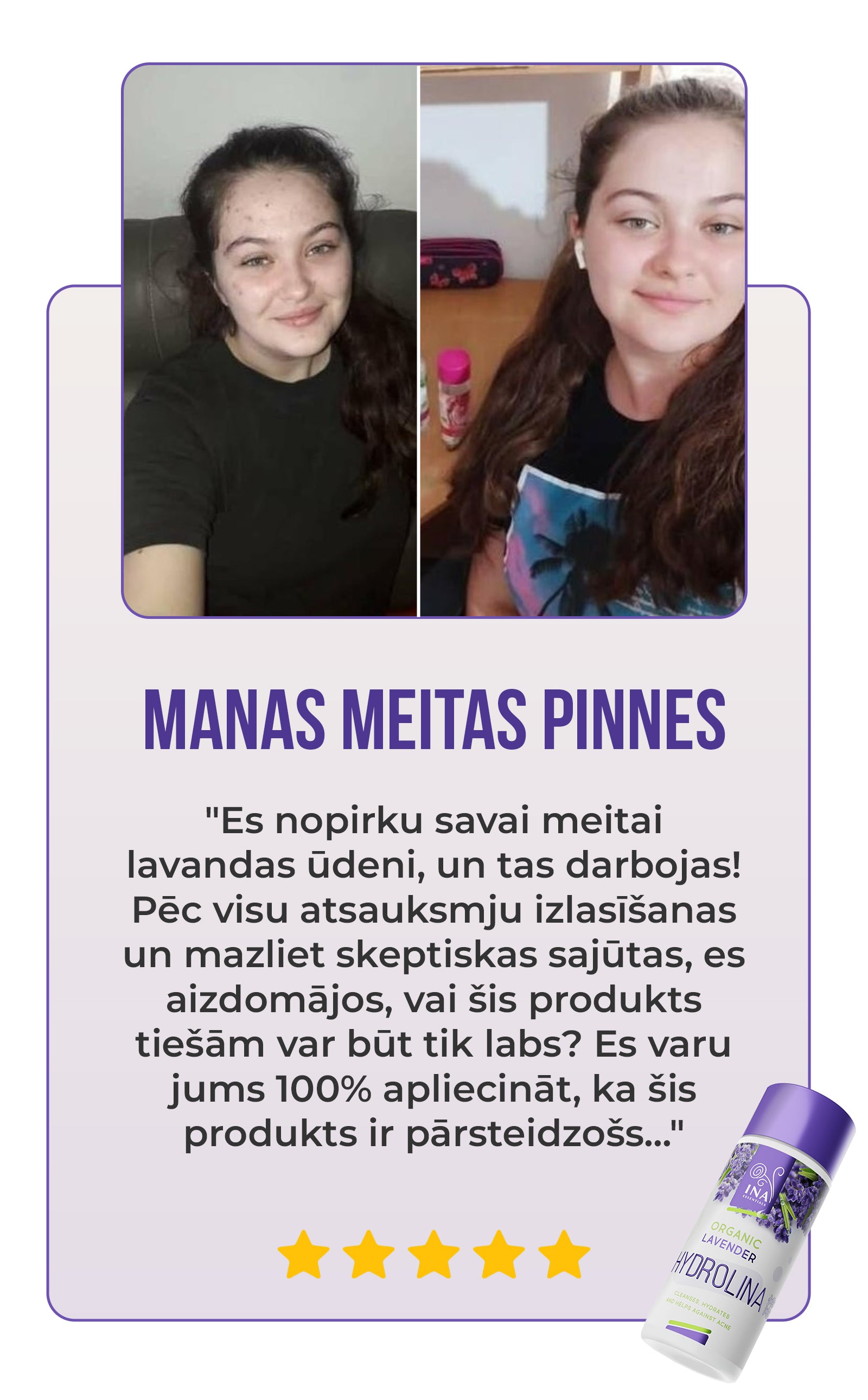 - 2. Solis: pēc tam lietojiet mūsu lavandas Hydrolina Lavandas Hydrolina ar savu antibakteriālo iedarbību palīdz cīnīties ar akni un to atkārtošanos. Regulē ādas pH līmeni, samazina iekaisumus un ādas taukainību. Attīra poras, kas palīdz novērst pinnes un melnos punktus.