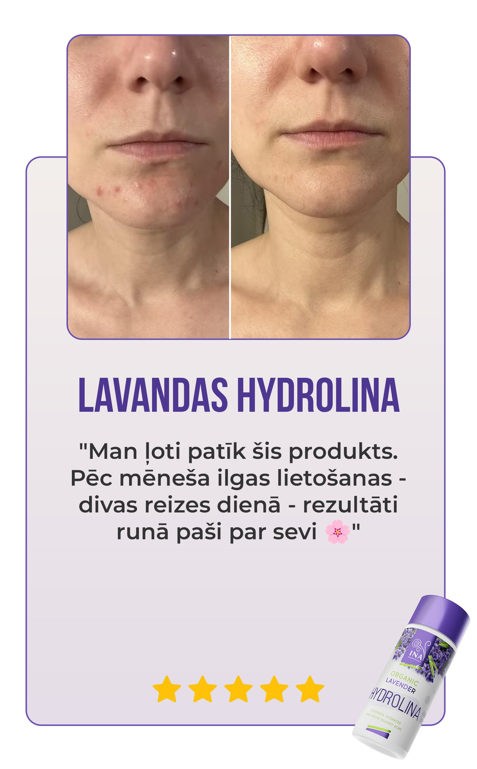 Lavandas Hydrolina ar savu antibakteriālo iedarbību palīdz cīnīties ar akni un to atkārtošanos. Lieliski piemērots normālai un taukainai ādai, jo tā pH regulējošās īpašības.