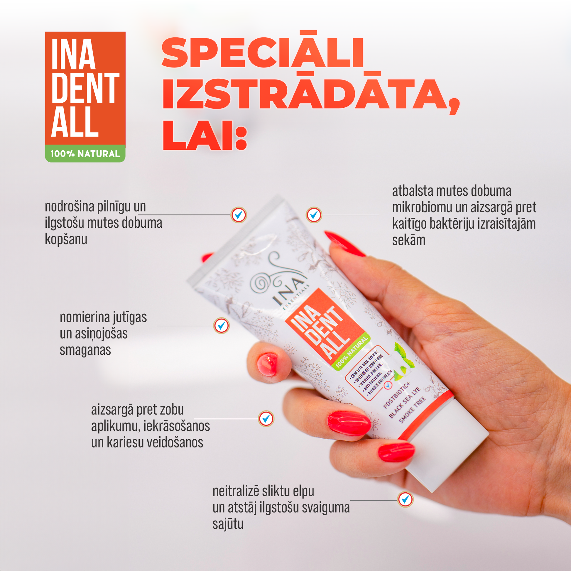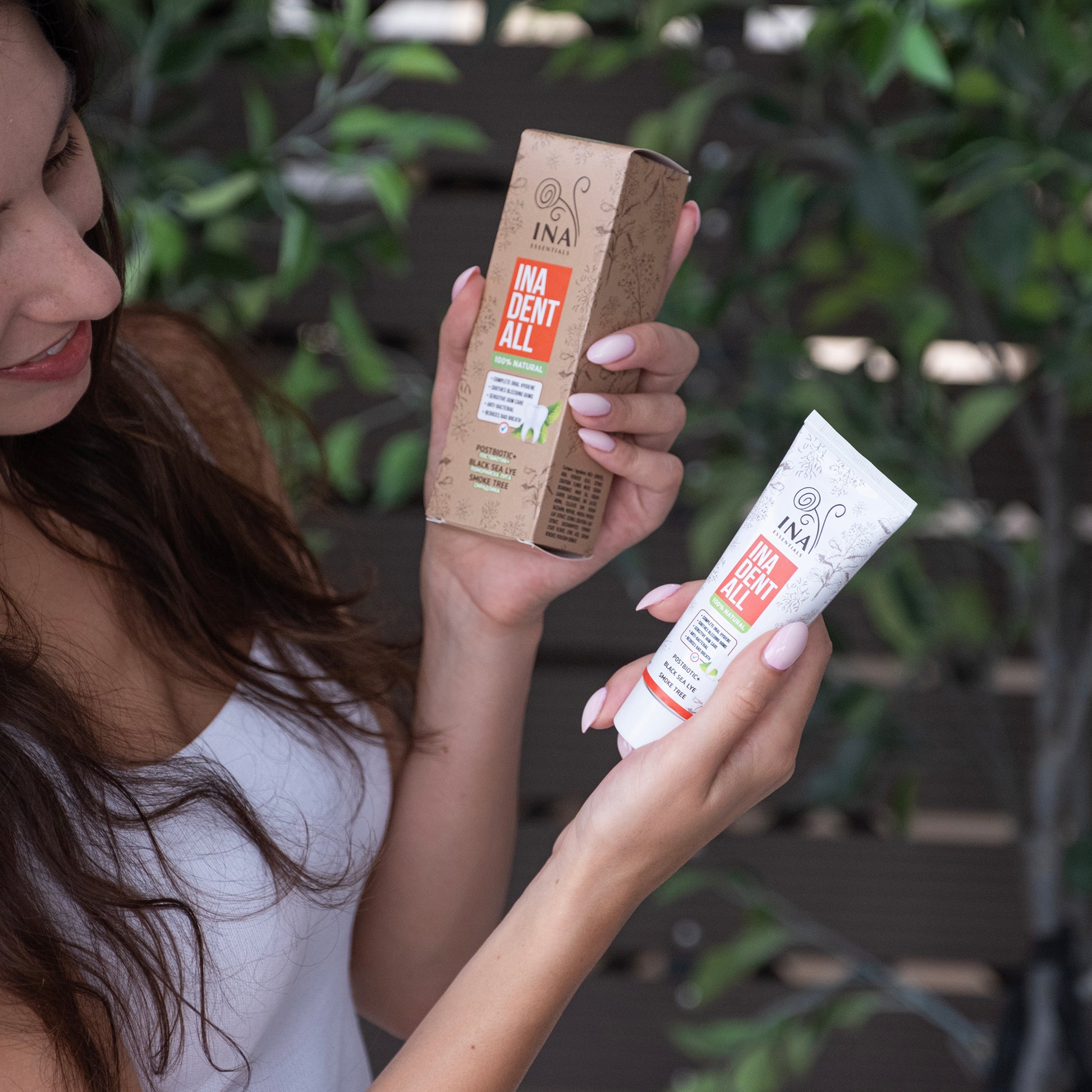 + Dāvana Dabīga Zobu Pasta bez Fluorīdiem ar Dūmu Koku, Melnās jūras Sārmu un Postbiotisku vielu - Ina Dent-All