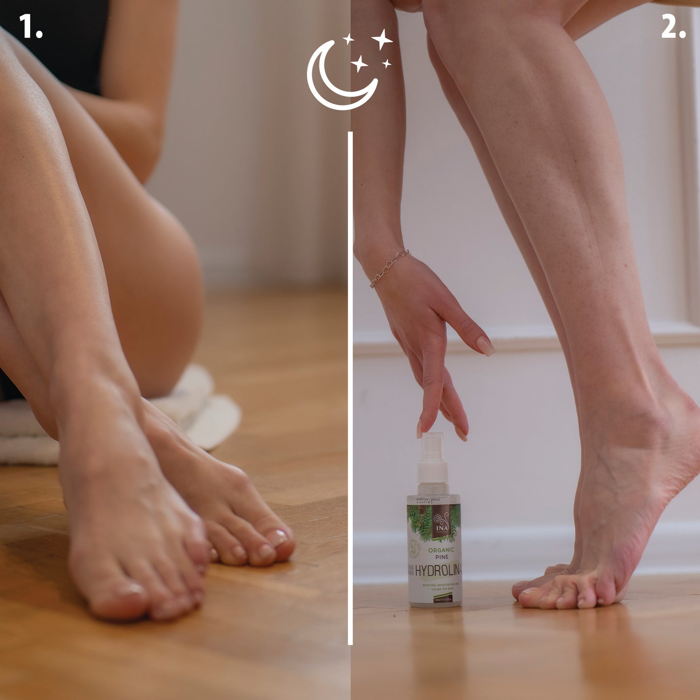 - 1. solis: Izsmidziniet mūsu ūdeni. Veimuta priedes Hydrolina palīdz pret mikroorganismiem, kas izraisa sēnīšu parādīšanos uz pēdām un nagiem. Pateicoties tā antibakteriālajām īpašībām, Veimuta priedes Hydrolina izmanto, lai novērstu sēnīšu infekcijas un apturētu mikroorganismu augšanu. Tā dezodorējošā iedarbība novērš nepatīkamu pēdu aromātu.