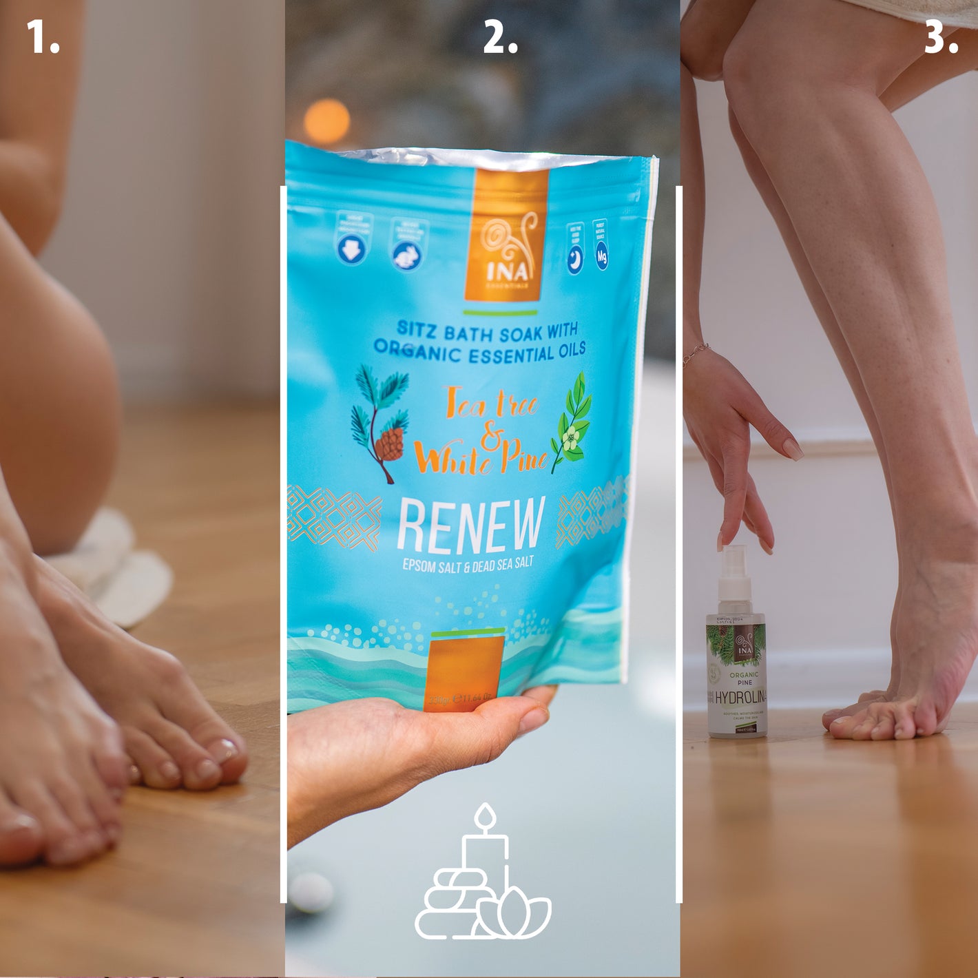 - 2. solis: Pēc tam iegremdējiet kājas mūsu Renew- Sitz sāls vannā ar tējas koka un priežu eļļu. Tas palīdz dziļi atjaunot un atjaunot ādu, savukārt spēcīgie sāļi un ēteriskās eļļas cīnās pret sēnīšu infekcijām un mīkstina ādu. Sāls sastāvā esošais magnijs veicina ādas reģenerāciju.