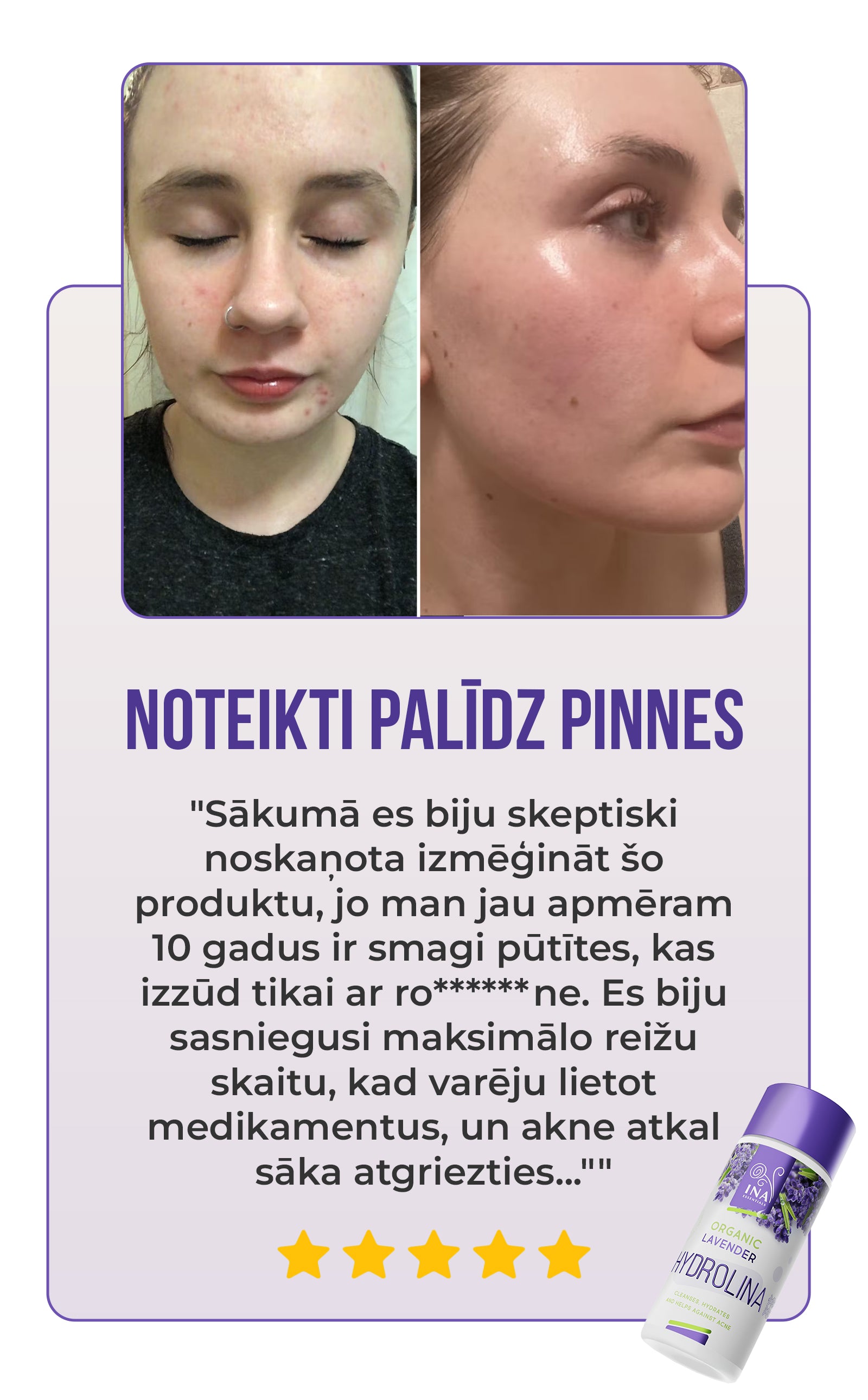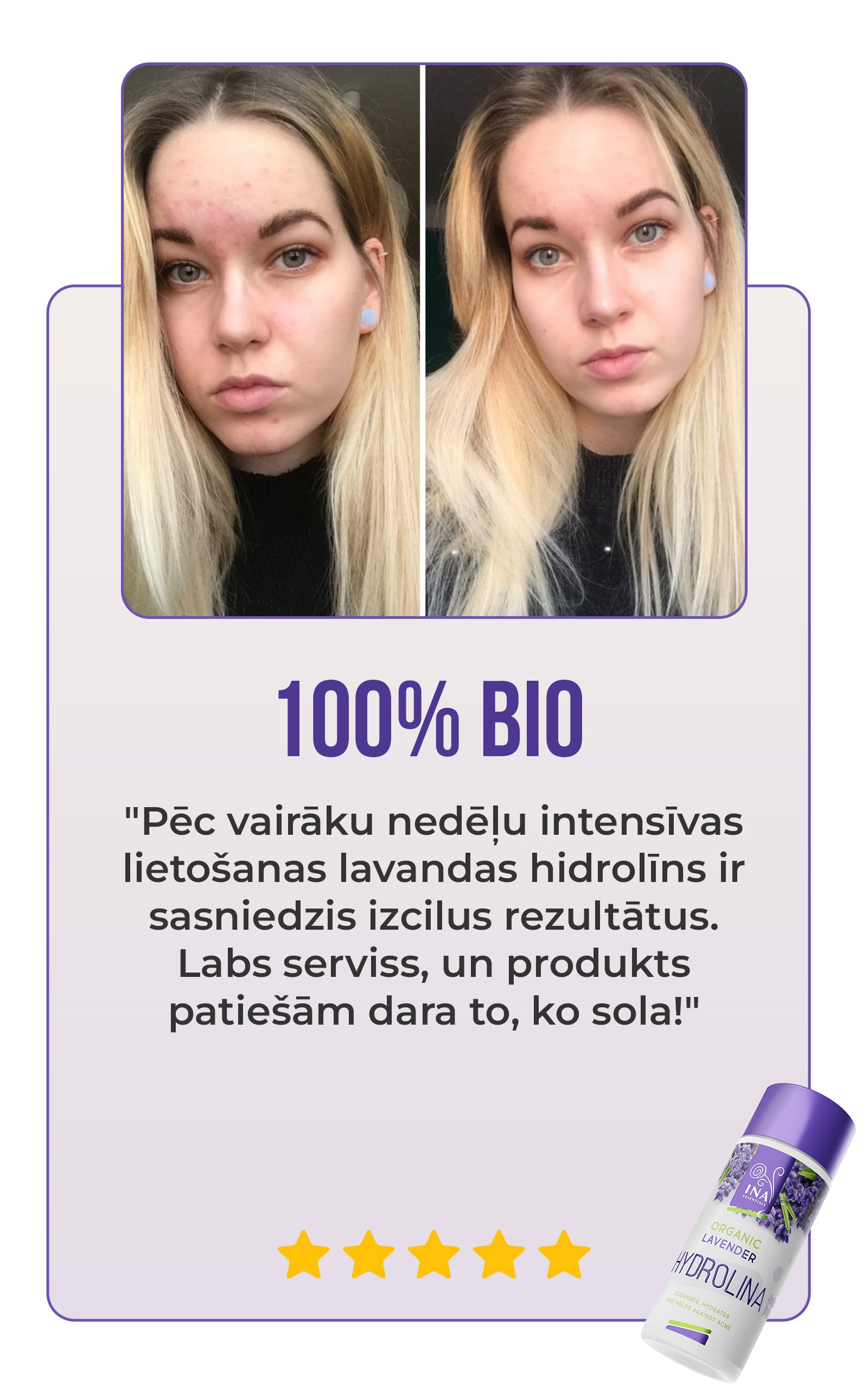 Lavandas Hydrolina (150 ml) ir ne tikai skaista pudelīte. Klīniskajos testos tā panākumu rādītājs ir vairāk nekā 90%, un tas pierāda, ka tā iedarbība palīdz mazināt pinnes un uzlabot ādas veselību. Noklikšķiniet, lai apskatītos informāciju par sertifikātu