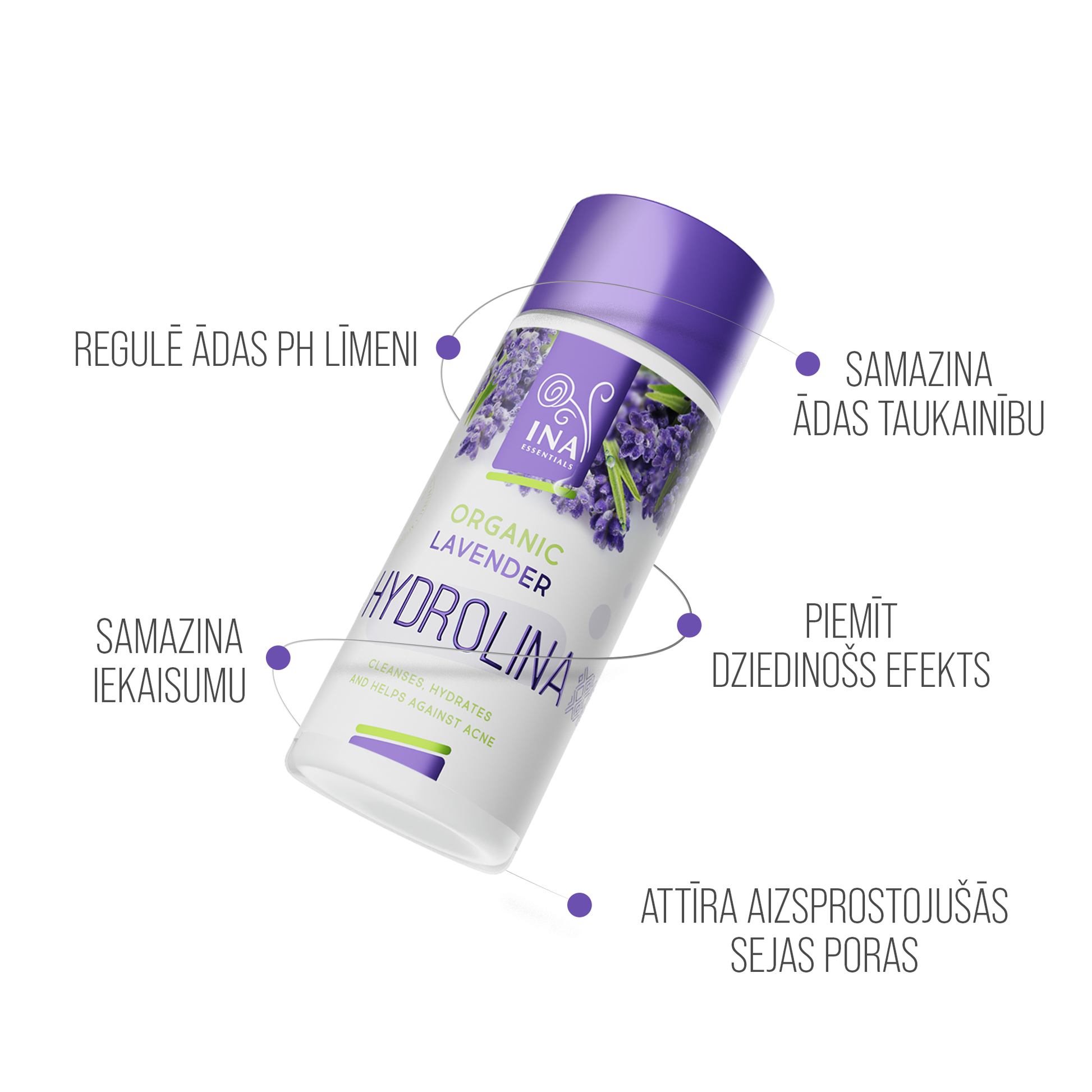 Lavandas Hydrolina dziļi attīra poras un kontrolē sebuma veidošanos. Poras saraujas, samazinās apsārtums, padarot ādu ievērojami tīrāku.