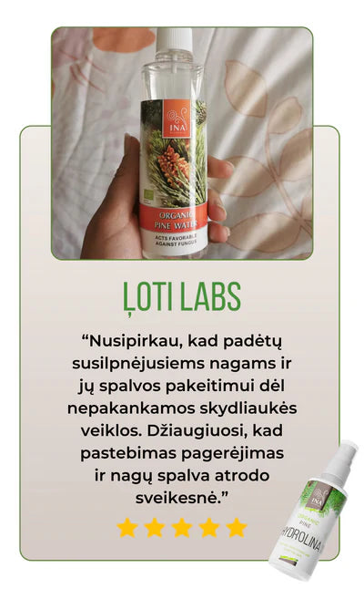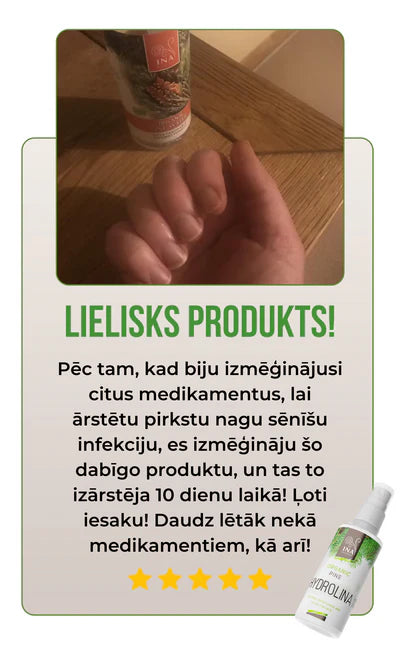 Veimuta priede Hydrolina (150 ml) ir ne tikai skaista pudelīte. Ar iespaidīgu klientu apmierinātības novērtējumu, kas pārsniedz 90%, mūsu produkts apliecina savu efektivitāti nagu sēnītes apkarošanā un nepatīkamas pēdu smakas mazināšanā. Neticiet tikai mūsu vārdiem, bet izlasiet viņu stāstus.