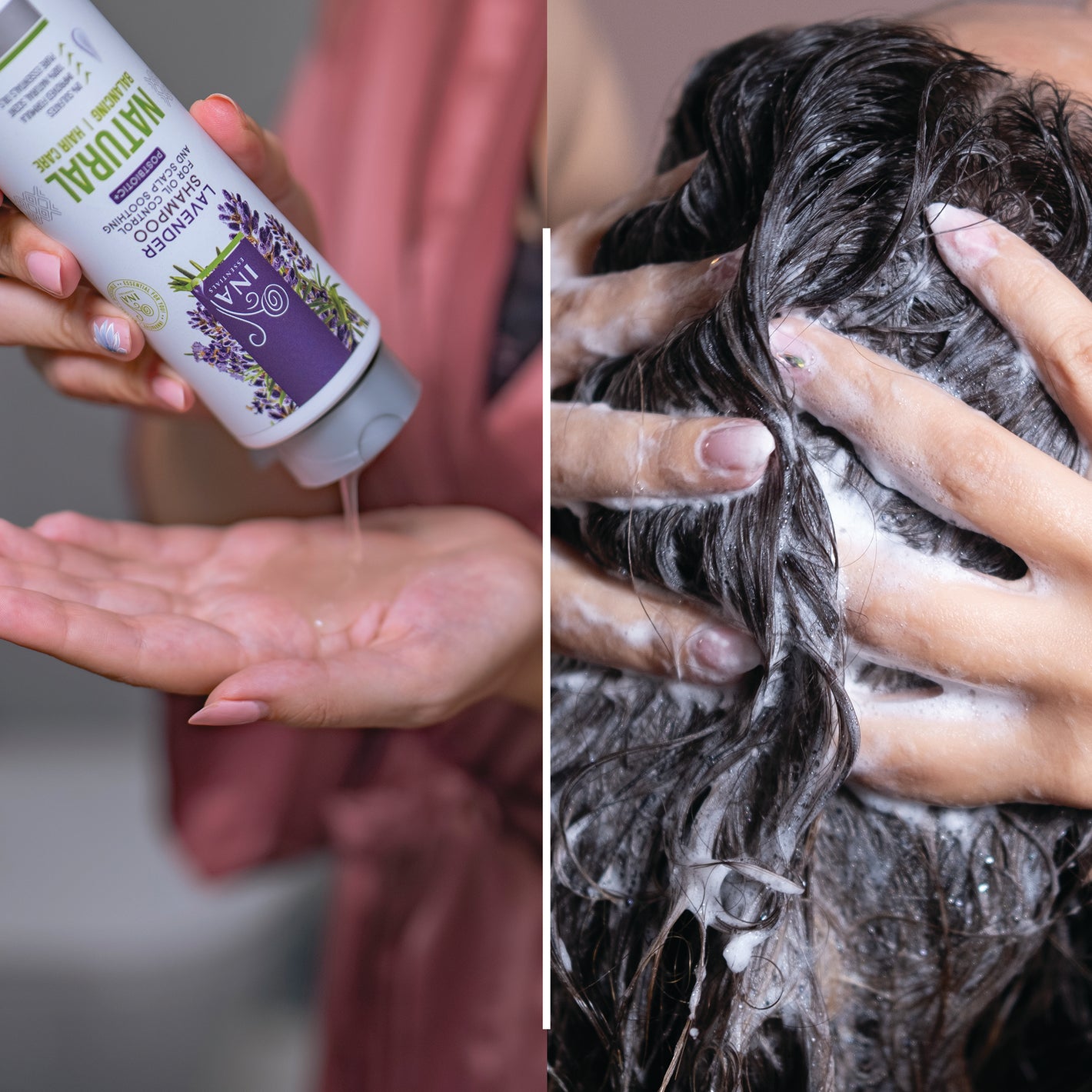 - 1. solis: Lai nomazgātu netīrumus, sāciet galvas ādas attīrīšanu ar mūsu jauno lavandas šampūnu pret blaugznām, kas bagātināts ar alvejas postbiotisko kompleksu - fermentētu alvejas ekstraktu. Tas nomierina galvas ādas kairinājumus un aizsargā galvas ādu no kaitīgiem mikroorganismiem un blaugznas izraisošām baktērijām, veicinot vispārēju matu veselību.